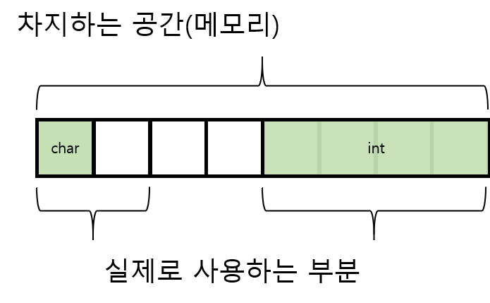 1byte char 자료형과 4byte int 자료형은 총 합은 5byte 이지만, 4byte의 배수인 8byte 로 올림해버리고, 나머지 3byte는 그냥 버리게 됩니다.