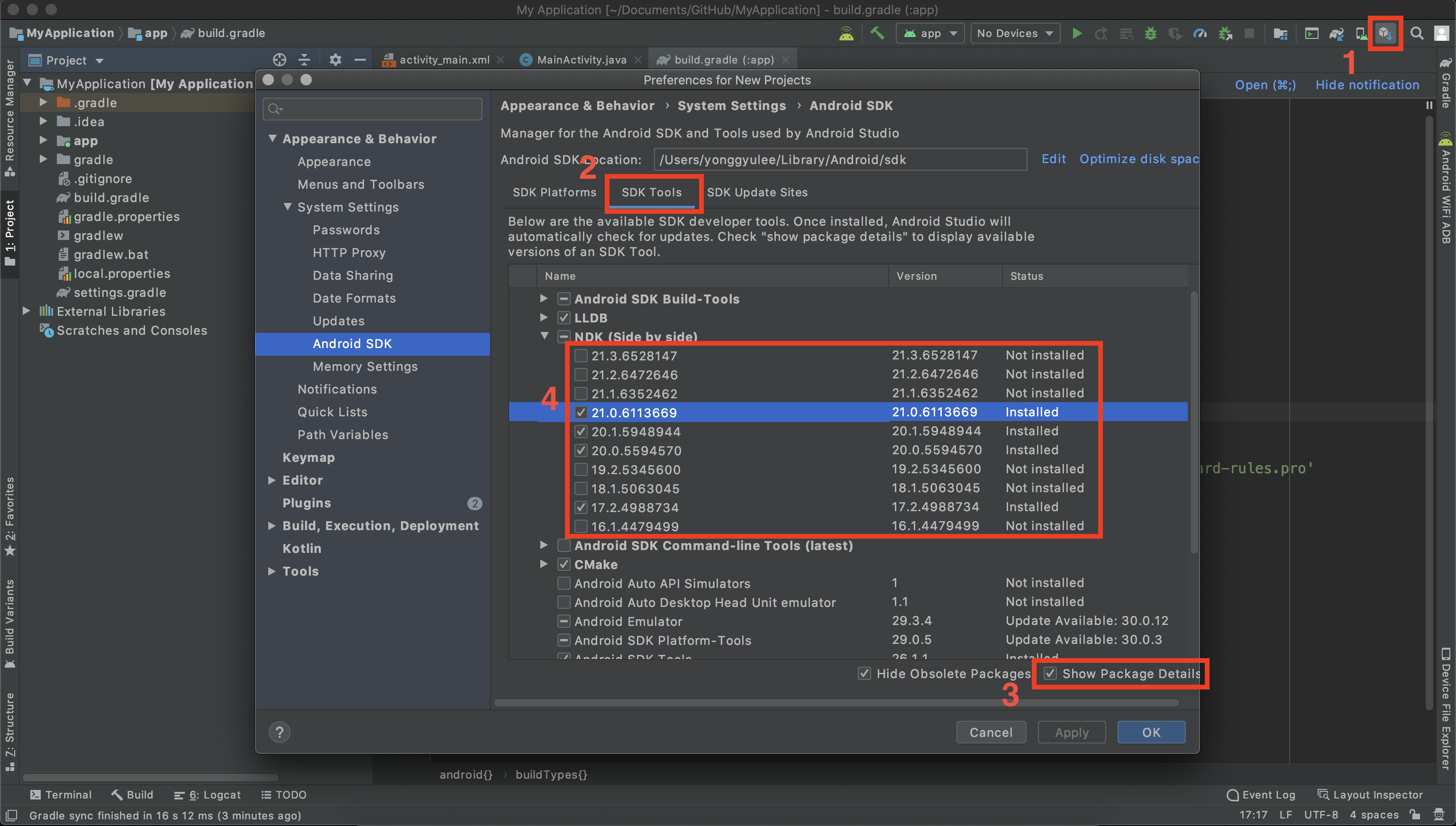 Android Studio 에서 새 프로젝트를 만든 후, NDK가 설치되어 있지 않다면 설치해줍니다.